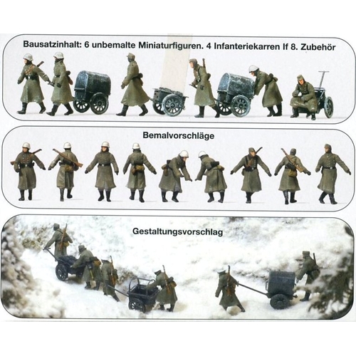 PF16592 ドイツ軍 荷車で銃器などを運ぶ兵士 1939-45年 WW-II 未塗装キット 1/87 人物6体(H約1.5-2cm)、荷車4台、銃器、手榴弾他