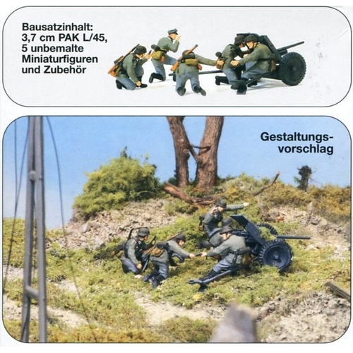 PF16591 ドイツ軍 3.7cm対戦車砲(PAK L/45)と砲兵隊員 1939-45年 WW-II 未塗装キット 1/87 人物5体(H約1.5cm)+銃器、手榴弾他