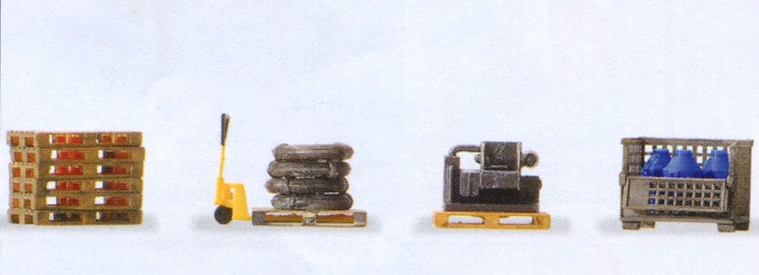 PF17704 倉庫、工場セット(パレット、カゴ、荷物他) 塗装済完成品 1/87 格子カゴ 約1.4×0.9×1.1cm パレット 約1.4×0.9cm