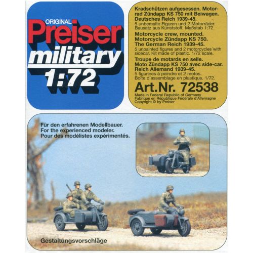 PF72538 ドイツ軍 バイク(ツェンダップ Zundapp KS 750)に乗っている兵士 1939-45年 WW-II 未塗装キット 1/72 人物5体+サイドカー付バイク2台
