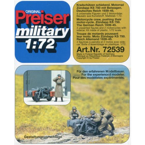 PF72539 ドイツ軍 バイク(ツェンダップ Zundapp KS 750)を押している兵士 1939-45年 WW-II 未塗装キット 1/72 人物4体+サイドカー付バイク2台