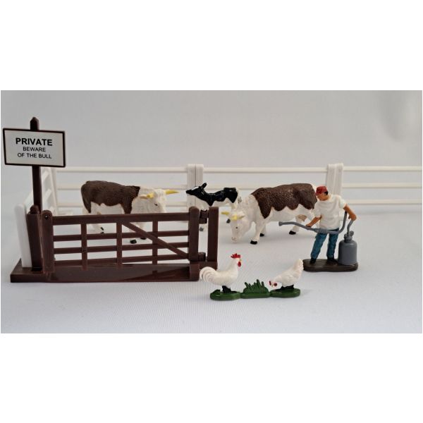 BR1764A 農場セットA 1/32 柵 L約12.5cm×4本 未塗装、以下塗装済 農場の門 L約12.5cm、 牛 オス L約8.0cm、 牛 メス L約8.0cm、 仔牛 白/黒 L約5.0cm 、 酪農夫 H約5.5cm、 ニワトリ L約6.0cm