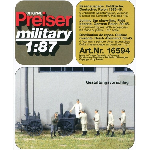 PF16594 ドイツ軍 野戦炊事セット(フィールドキッチン) 1939-45年 WW-II 未塗装キット 1/87 人物6体(H約2.2cm)、野戦炊飯車2台