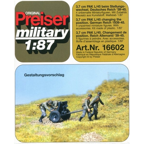 PF16602 3.7cm対戦車砲(PAK L/45)と砲兵隊員 ドイツ軍 1939-45年 未塗装キット 1/87 人物4体(H約1.5-2.0cm)+銃器、手榴弾他