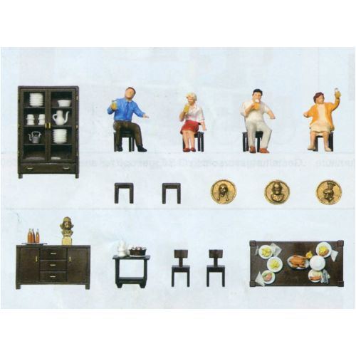 PF10657 ダイニングで食事中 塗装済 1/87 人物 H約1.5cm 4体+ダイニング家具