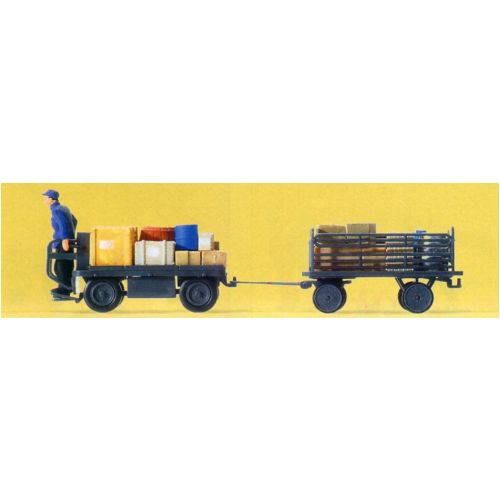 PF10256 荷物運搬用電気自動車とドライバー 塗装済 1/87 車L約3.4cm+荷車L約4.0cm