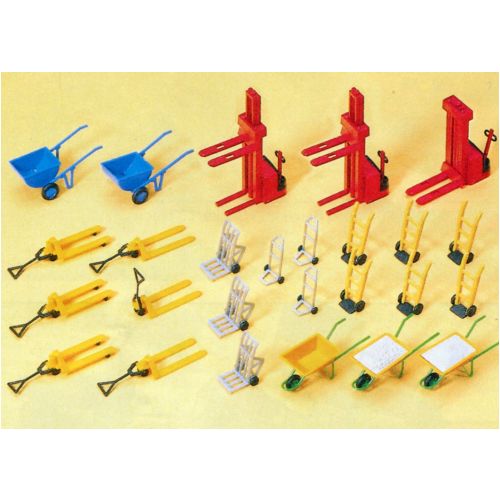 PF17107 未塗装キット 倉庫用具セット(リフト,台車,1輪車,他) 1/87 リフト=H約2.7cm