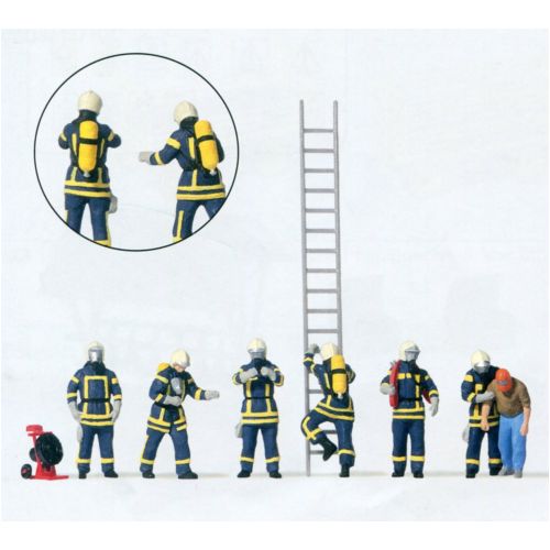 PF10765 呼吸装置を付けた消防士と救助された人 ユニフォームブルー 塗装済 1/87 H約2.1cm 7体+ハシゴ他入
