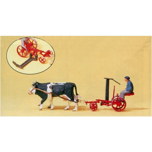 PF30443 牛に刈り取り器具を引かせる農夫 塗装済 人物H約1.5cm、牛H約1.5cm 牛2頭、農夫1体入
