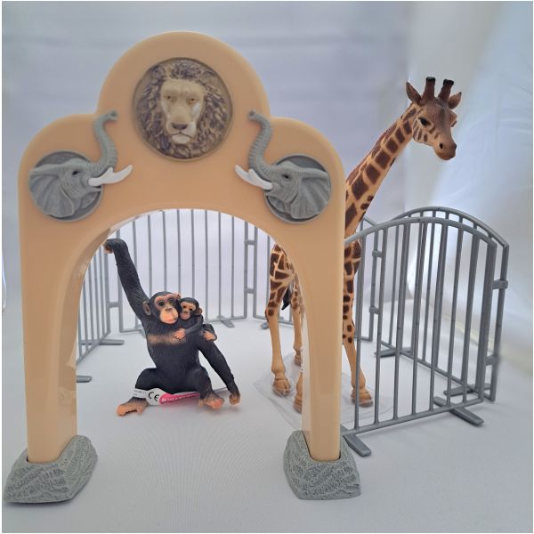 BG63301A 動物園セットA 塗装済 ゲート最大内寸高さ約13.5×幅11.5cm (外寸高さ約21cm)、フェンス高さ12.5×幅13.7cm 5枚 チンパンジー親子高さ10.5cm キリン高さ約20cm