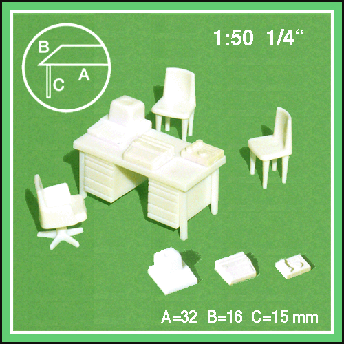SZ55.43211.1 未塗装 事務机セット (ホワイト) 1/50 机 W3.1cm/D1.6cm/H1.5cm 1台+イス3脚、備品