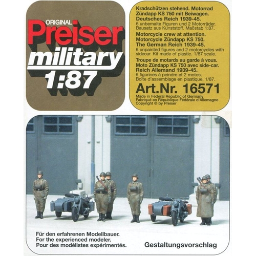 PF16571 ドイツ軍 オートバイ(KS 750.)/乗員 1939-45年 WW-II 未塗装キット 1/87 サイドカー付バイク 2台、人物6体、銃器、手榴弾