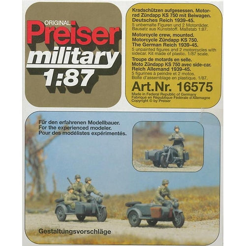 PF16575 ドイツ軍 オートバイ(KS 750.)/クルー 1939-45年 WW-II 未塗装キット 1/87 サイドカー付バイク 2台入/人物 5体入