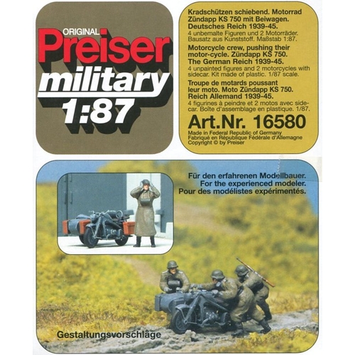 PF16580 ドイツ軍 オートバイ(KS 750.)/乗員 1939-45年 WW-II 未塗装キット 1/87 サイドカー付バイク 2台、人物4体、銃器、手榴弾